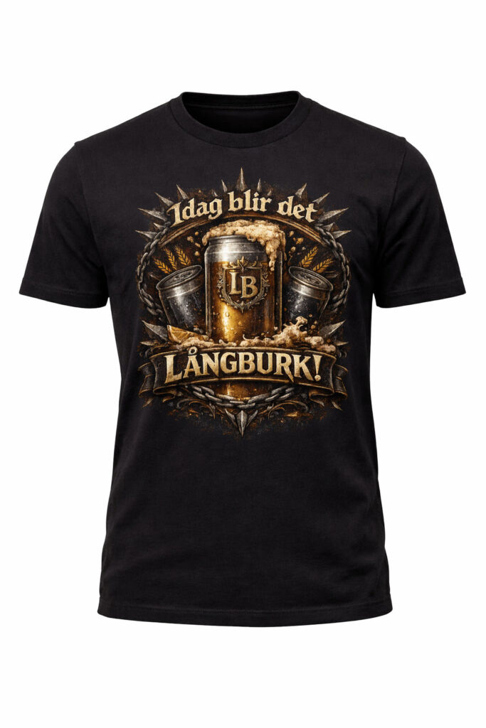Den här t-shirten kombinerar rå metal-estetik med svensk ölkultur i ett tungt, detaljerat tryck. Den centrala långburken med LB-emblem, omgiven av kedjor, nitar och mörka gulddetaljer, signalerar exakt vad kvällen handlar om – utan att be om ursäkt.