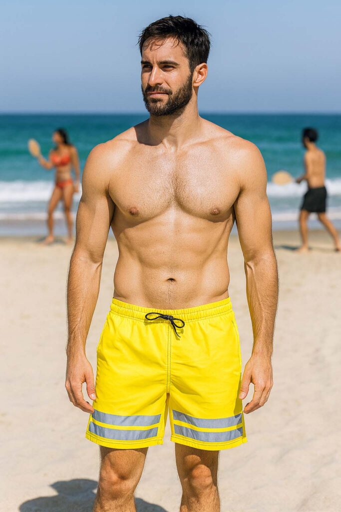 Syns på stranden! Bekväma badbyxor med reflexdetaljer som gör dig svår att missa. Perfekta för sommarens alla äventyr.